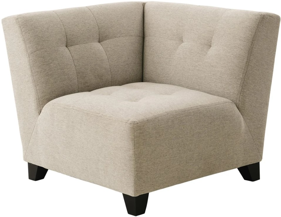 Upholstered in a tan woven fabric with taupe, dark brown, and black undertones, this corner modular piece features a padded back and seat cushion with tufting, a tailored base, and tapered feet in an espresso finish.Read More