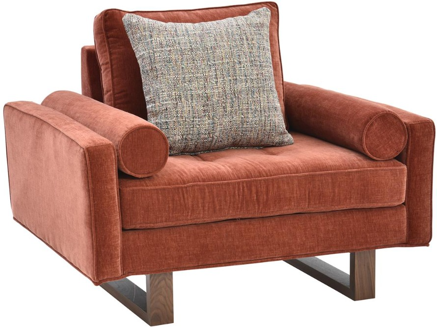 Upholstered in a retro paprika-colored soft fabric, this roomy chair features a reversible back cushion, button-tufted reversible seat cushion, padded arms with rolled side pillows, one contrasting toss pillow, and a wooden bracket base in a brown finish.Read More