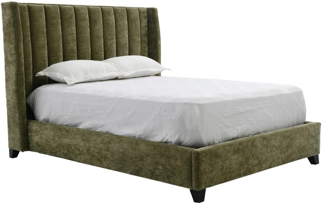 Upholstered in a dark sage green velour fabric, this bed features a padded channeled headboard, matching rails, a low profile footboard, and tapered block feet in a dark brown finish.Read More