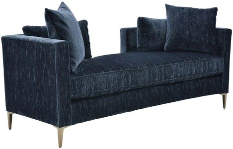 Upholstered in navy-blue velour fabric, this contemporary settee features a padded tight back with an opening in the middle, plump seat cushion, padded track arms, two matching toss pillows, tailored base, and brass metal bracket legs.Read More