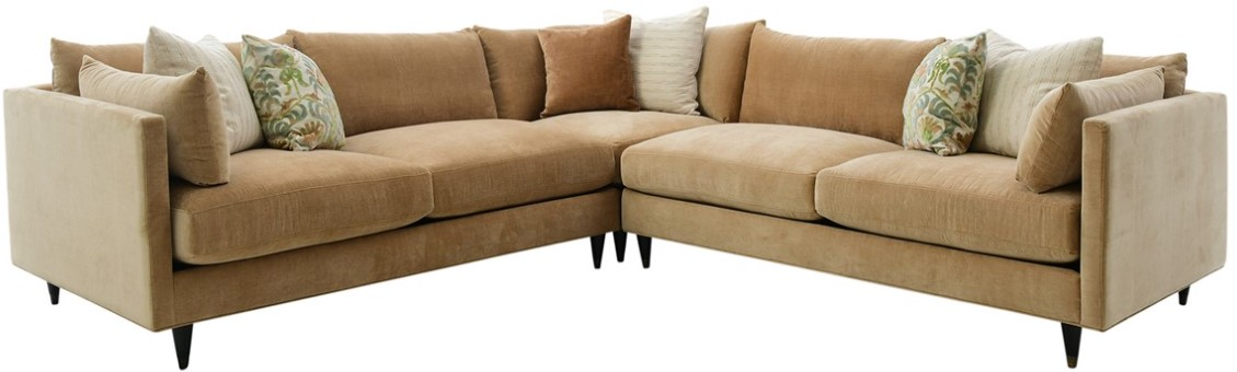 Upholstered in a cork-brown velour fabric, this sectional features reversible back and seat cushions, two bolster pillows, padded track arms, six coordinating toss pillows, tailored base, and tapered legs in an espresso finish with brass caps.Read More