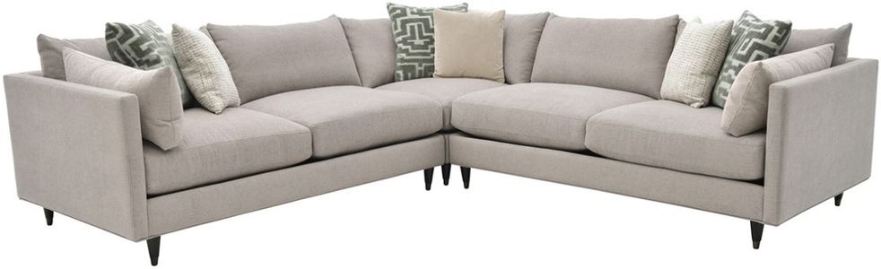 Upholstered in an oatmeal woven fabric, this sectional features sleek lines and deep seating with reversible back and seat cushions, padded track arms, two bolster pillows, five contrasting toss pillows, one coordinating toss pillow, tailored base, and tapered legs in an espresso finish with brass caps.Read More
