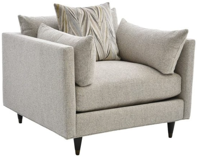 Upholstered in a pebble gray woven fabric with dark gray, taupe, and cream undertones, this chair features sleek lines and deep seating with a reversible back and seat cushion, bolster pillows, padded track arms, a contrasting toss pillow, tailored base, and tapered legs in an espresso finish with brass caps.Read More