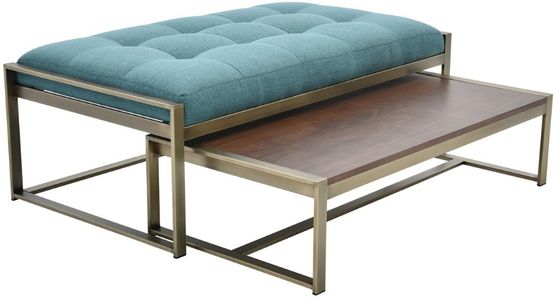 The nesting ottoman features a padded seat cushion with tufting upholstered in a turquoise woven fabric with black undertones. The nesting table has a handsome wooden top in a dark brown finish. This nesting ottoman and table also showcase a metal base in a brushed nickel finish.Read More