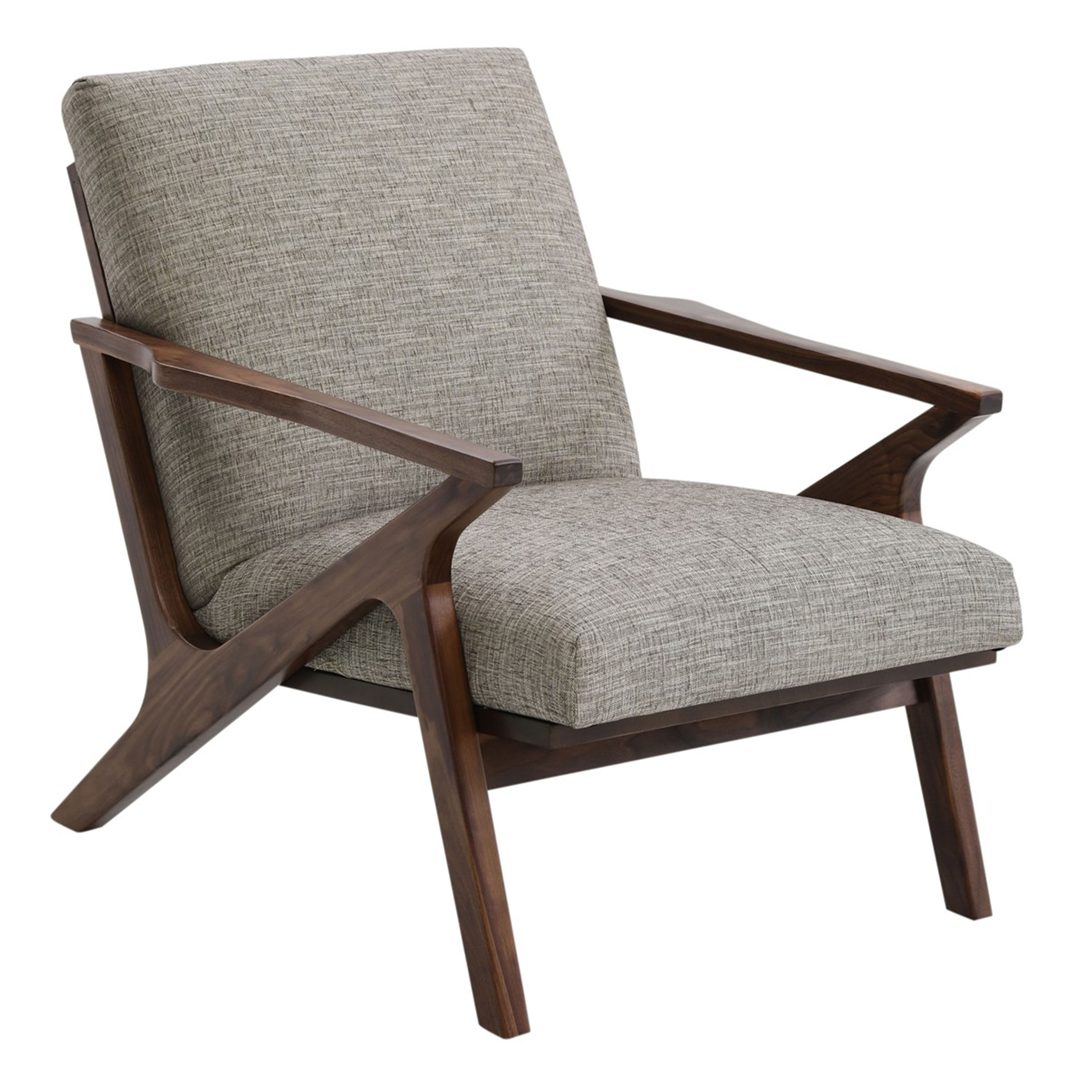 With a wooden frame in a dark brown finish, this accent chair features a plump back and seat cushion upholstered in a light gray woven fabric with dark brown and taupe undertones, wooden arms, and splayed legs.Read More