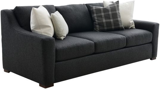 Upholstered in a dark charcoal woven fabric with gray undertones, this sofa features reversible back and seat cushions, padded track arms, three coordinating toss pillows, one coordinating kidney pillow, tailored base, and black feet in a dark brown finish.Read More