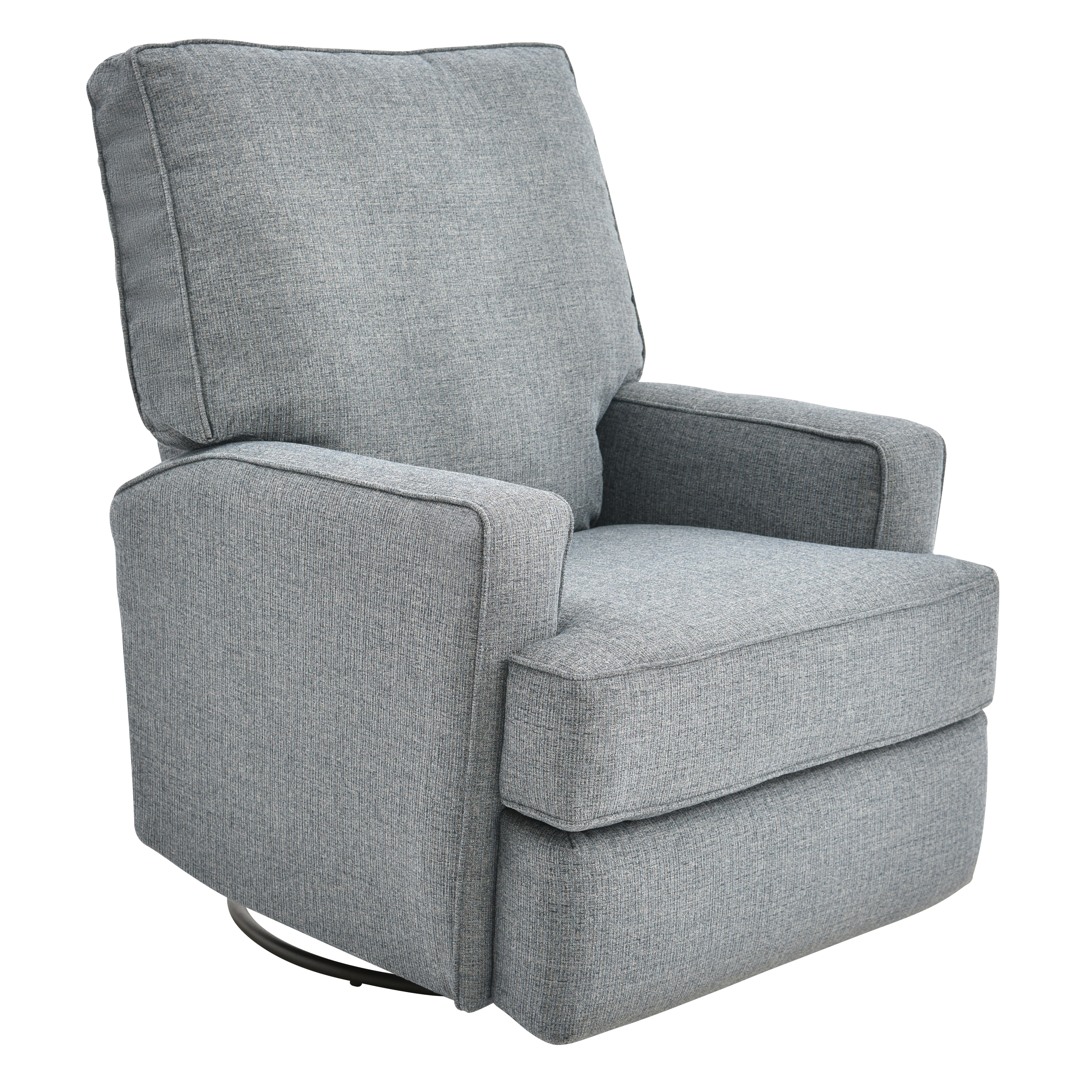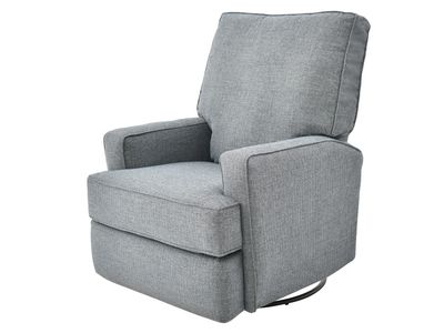 Upholstered in a denim woven fabric, this recliner features a padded back, plump seat cushion, padded track arms, tailored base, and a 360-degree swivel and gliding base.Read More