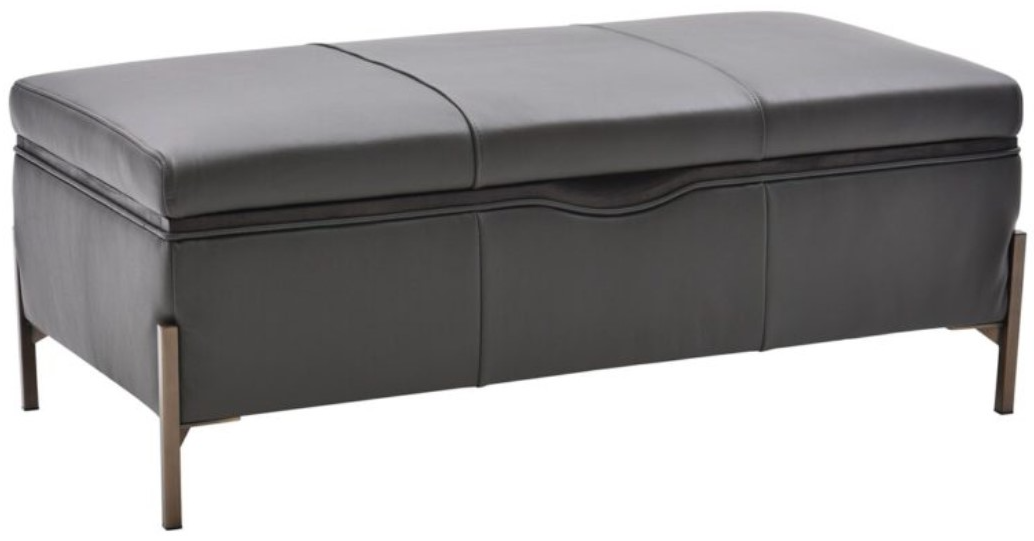 Upholstered in a charcoal embossed faux leather, this storage ottoman features a padded seat cushion, dark brown wooden rim with a hand insert to lift the top, and brushed bronze finished metal feet.Read More