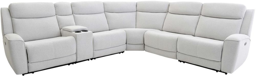Upholstered in a light gray woven fabric with dark gray and black undertones, this sectional features power reclining headrests and chaise footrests, padded track arms, stitched accents, padded lift-top storage, two cupholders, two USB ports, and two USB-C ports.Read More