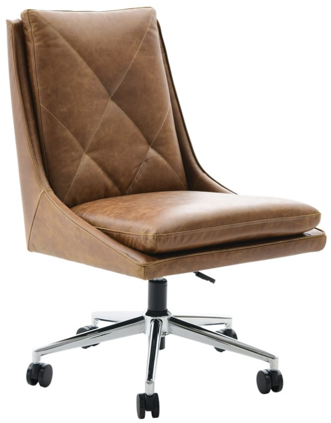 Upholstered in a caramel brown top-grain leather, this desk chair features a padded tufted back, a plump seat cushion, stitched accents, a metal five-star base in a silver finish, and casters.Read More