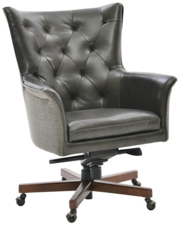 Upholstered in a dark gray leather, this swivel and tilting desk chair features a plump tufted back cushion, plump seat cushion, padded arms, gray woven fabric upholstered back and sides, adjustable seat height, casters, and a five-star 360-degree dark brown wooden finished base.Read More
