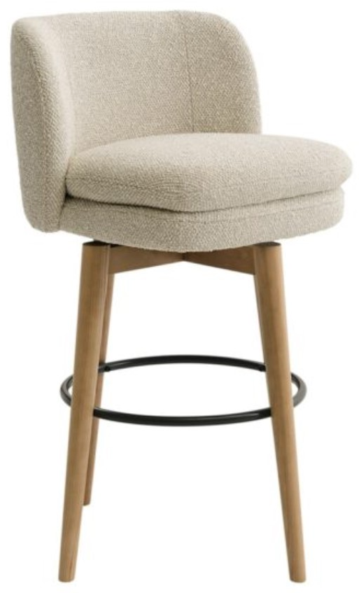 Upholstered in a cream woven fabric with tan and taupe undertones, this bar stool features a padded curved back, a padded 360-degree swivel seat cushion, wooden tapered legs in a natural finish, and a black metal footrest.Read More
