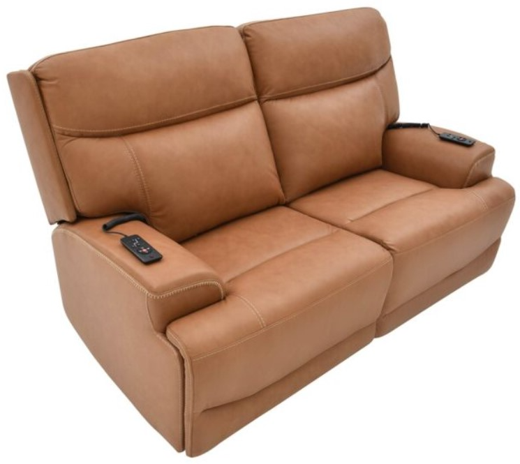 Upholstered in a caramel-colored leather where body contact occurs, this loveseat features two power reclining headrests and chaise footrests, plump seat cushions, padded arms, and contrasting stitched accents. It also features back massage, heat, lumbar support, and zero-gravity reclining.Read More