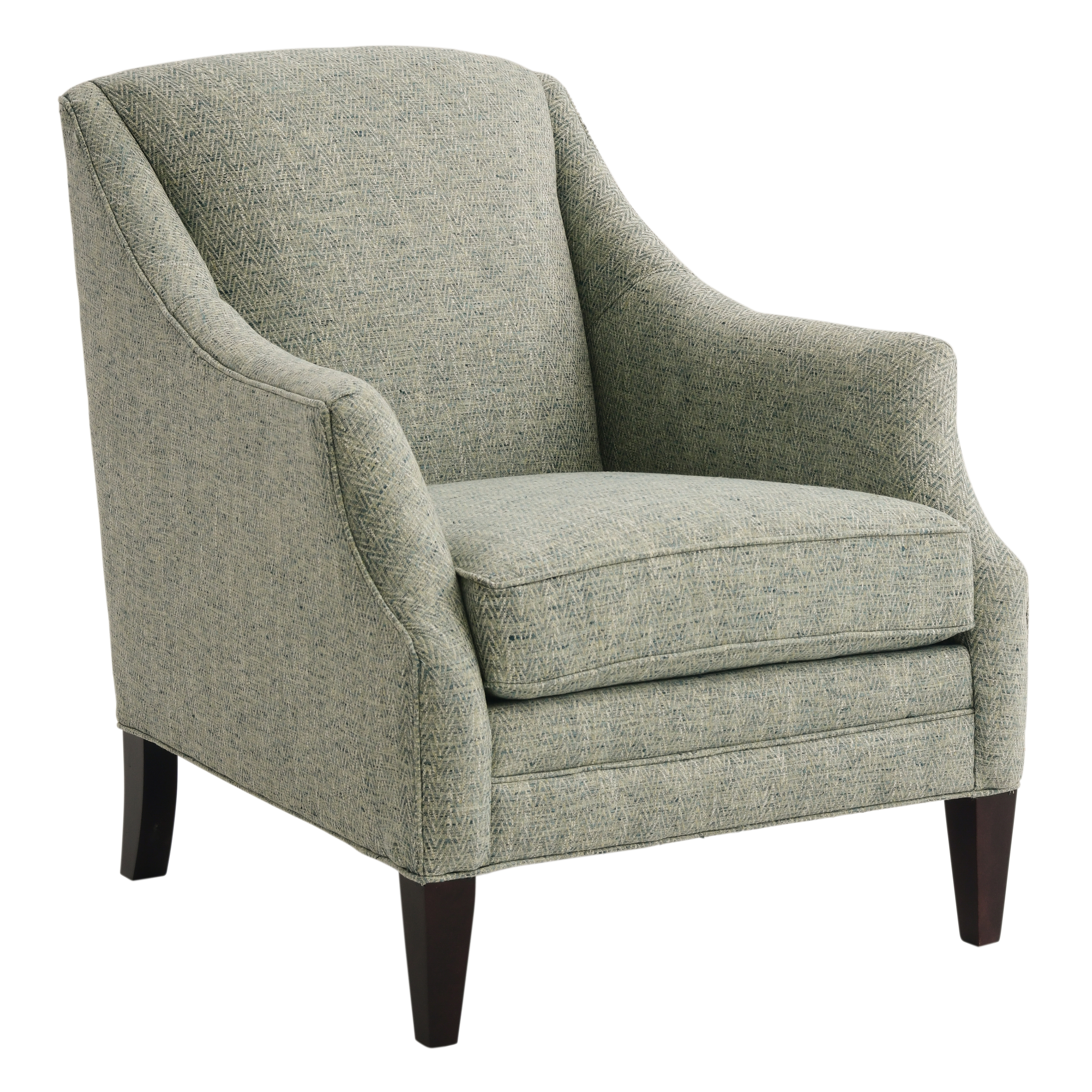 Upholstered in a patterned seafoam green woven fabric with blue, light blue, off-white, and sand-colored undertones, this club chair features a padded tight back, reversible seat cushion, padded arms, tailored base, and tapered feet in a light brown finish.Read More