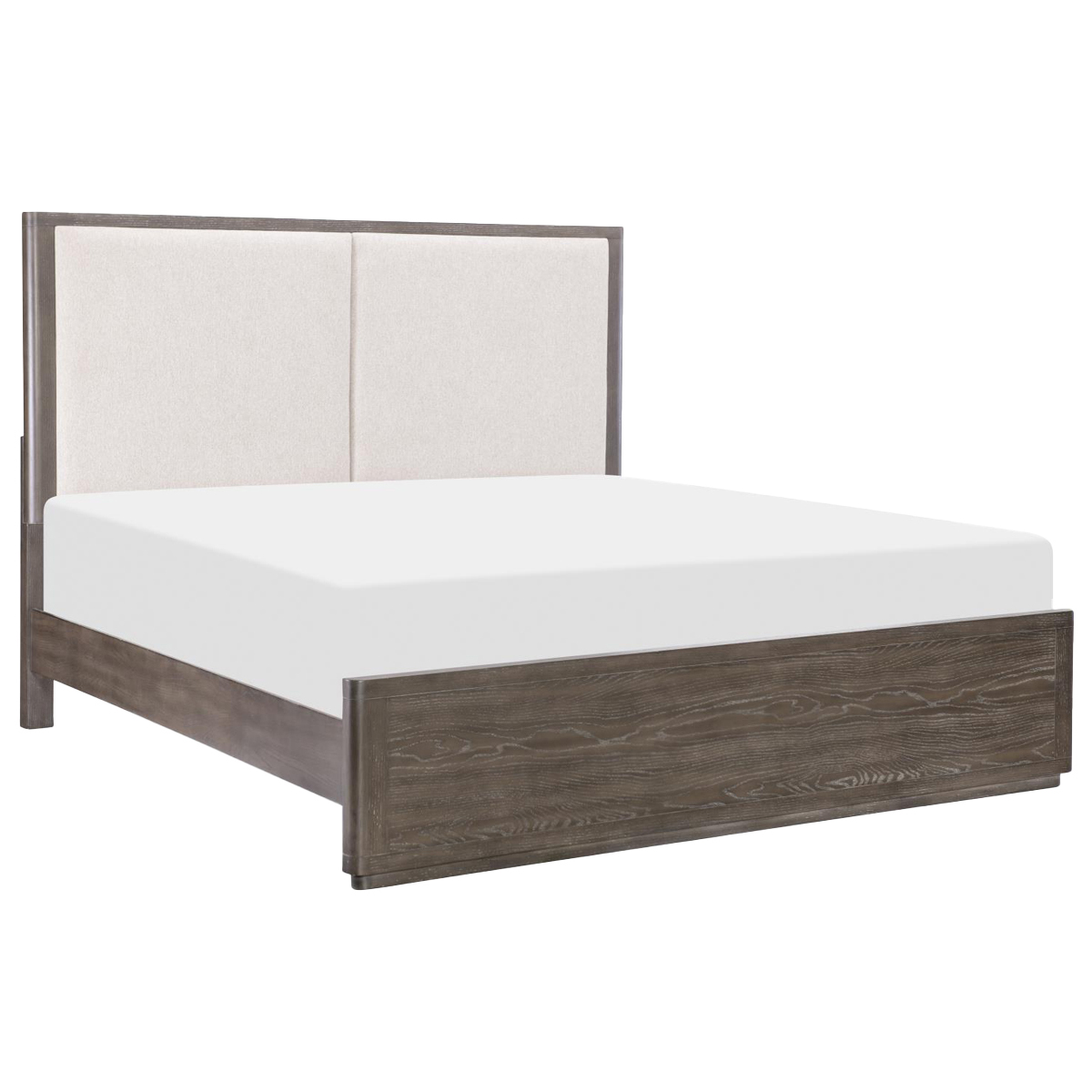 Crafted with select hardwood solids and embossed oak veneers in a rich sable brown finish, this bed features a panel headboard with a padded inset upholstered in a taupe and cream woven fabric, matching rails, and a low-profile footboard.Read More