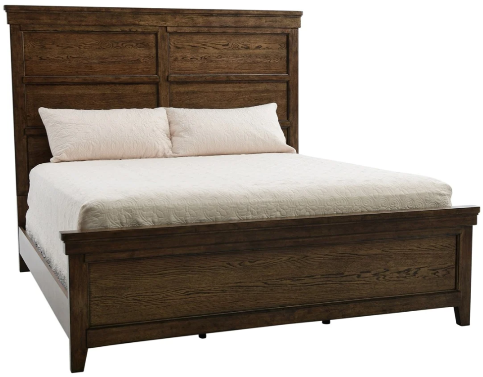 Crafted with select hardwood solids and veneers in a hazelnut finish, this bed features a panel headboard and footboard, matching rails, and tapered front feet. A perfect balance of elegance and durability for restful nights.Read More