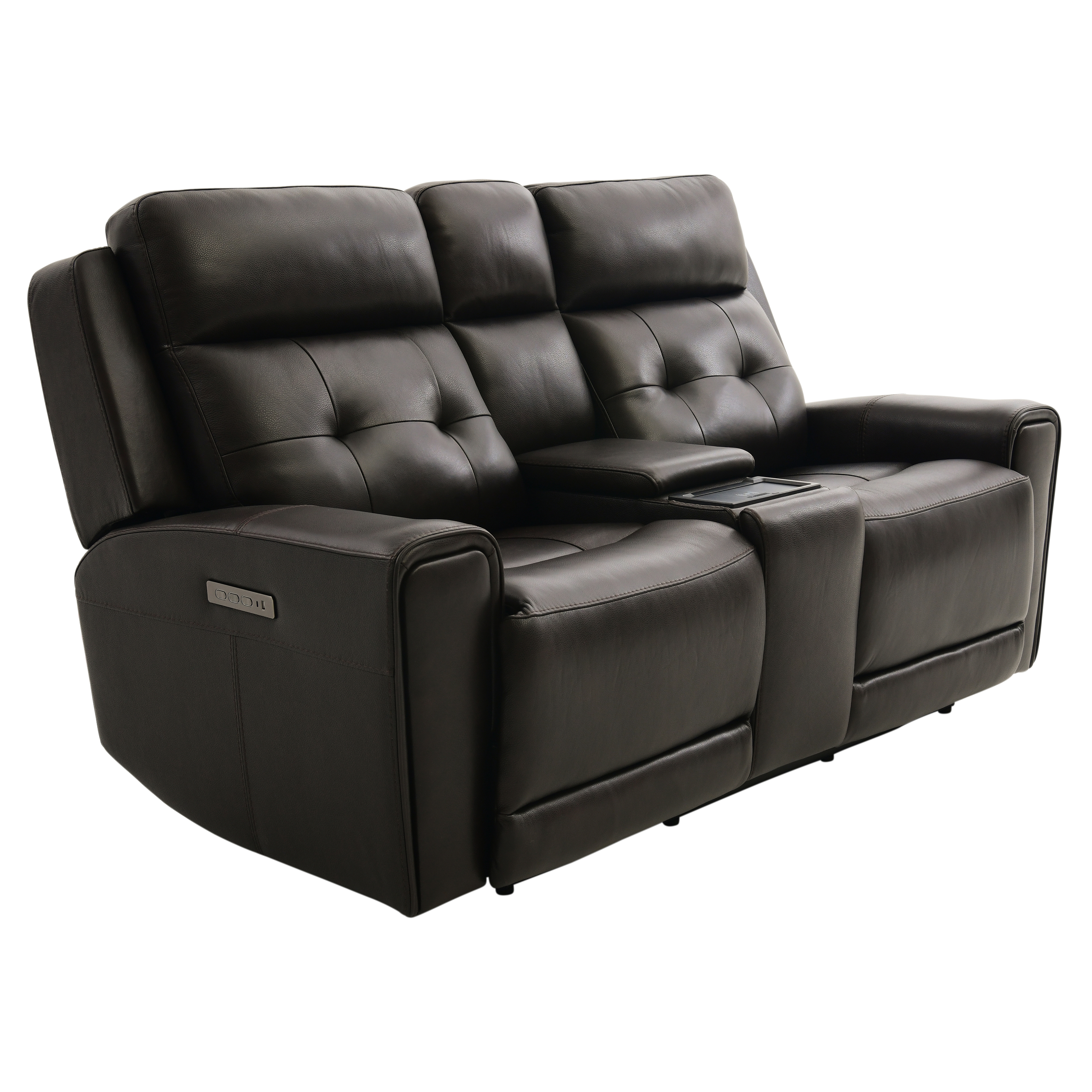Indulge in the plush, dark brown leather upholstery while relishing the convenience of the built-in console, ideal for storing your essentials. Effortlessly recline with the touch of a button, embracing a world of relaxation and elegance in your living space.Read More