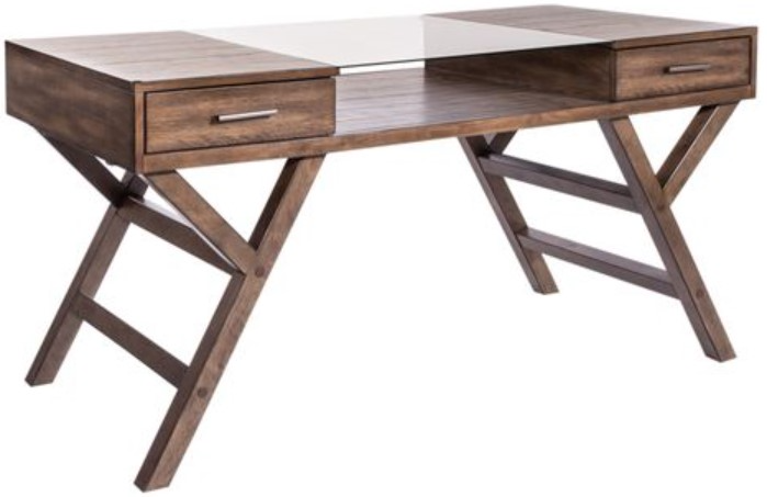 Work from home or the office in comfort and style with the Lennox writing desk. Crafted of rubberwood solids with split heart white oak veneers, this piece features a weathered chestnut finish, accented with pewter bar pull hardware. The floating tempered glass insert adds a unique design appeal with a storage shelf beneath.Read More