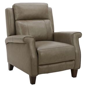 Upholstered in a mushroom brown leather, this recliner features a plump back and seat cushions, padded key arms, stitched accents, and tapered feet in a dark brown finish.Read More
