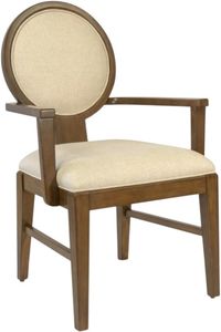 Crafted of white oak with a mappa burl in a chestnut brown finish, this arm chair features padded circular back and plump seat cushion upholstered in a cream woven fabric with taupe undertones, wooden track arms, and tapered legs. The circular back has a burled and grooved design on the back of the chair.Read More
