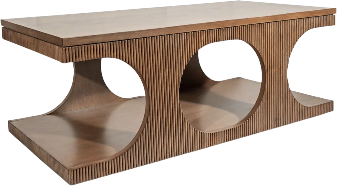 Crafted of white oak with a mappa burl in a chestnut brown finish, this coffee table features a handsome burled top, a lower shelf, and architectural cutouts on the sides with a grooved design.Read More