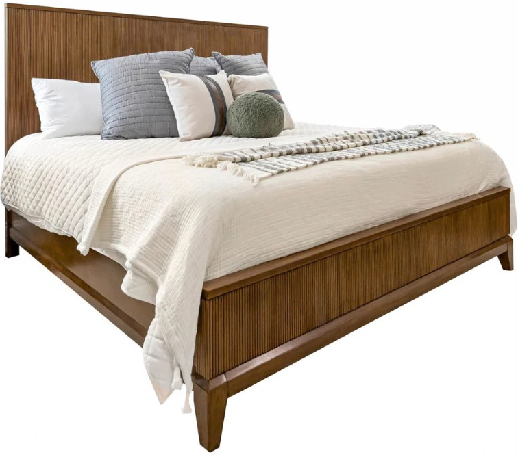 Crafted of white oak with a mappa burl in a chestnut brown finish, this bed features a grooved panel headboard and low-profile footboard, matching rails, and tapered front feet.Read More