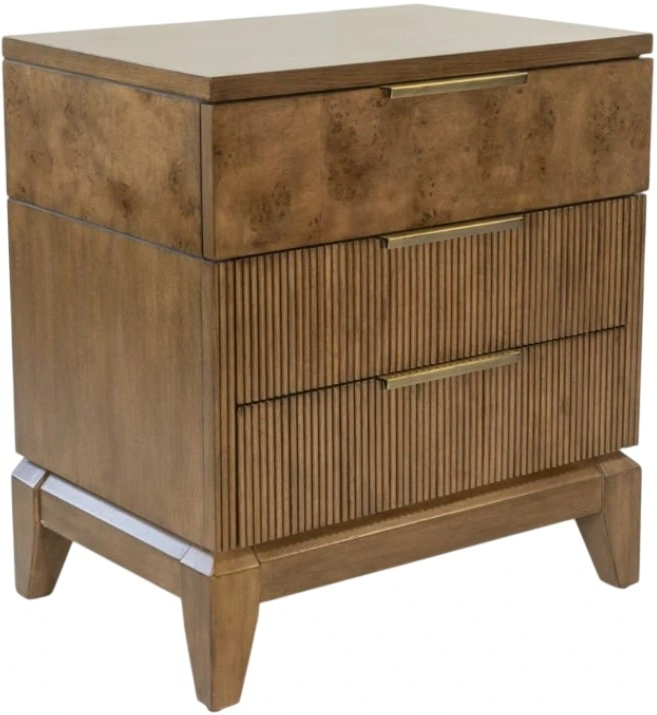 Crafted of white oak with a mappa burl in a chestnut brown finish, this nightstand features one drawer a with burled drawer front, two drawers with grooved drawer fronts, powder coated bronze finished metal pulls, two AC outlets, a USB port, a USB-C port, and tapered feet.Read More