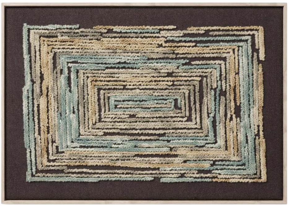 This artwork features wool hand-tufted lines in shades of teal, gray, yellow, and tan on a dark brown wool backdrop, with a wooden frame in a natural finish.Read More
