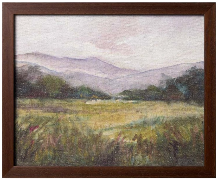 This wall art showcases a pasture and a distant tree line and mountain range in shades of cream, green, yellow, brown, and blue, with a frame in distressed dark brown finish.Read More
