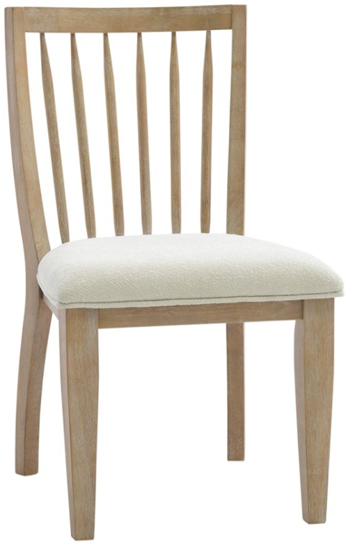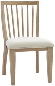 Crafted with select hardwood solids and veneers in a natural finish with a slight white-wash, this chair features a spindle back, a patterned plump seat cushion upholstered in a cream woven fabric, and tapered legs.Read More