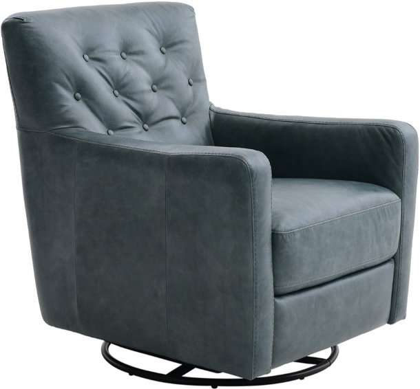 Upholstered in a slate-blue top-grain Italian leather, this swivel chair features a padded button-tufted tight back, a plump seat cushion, padded track arms, tailored base, with a 360-degree swivel base.Read More