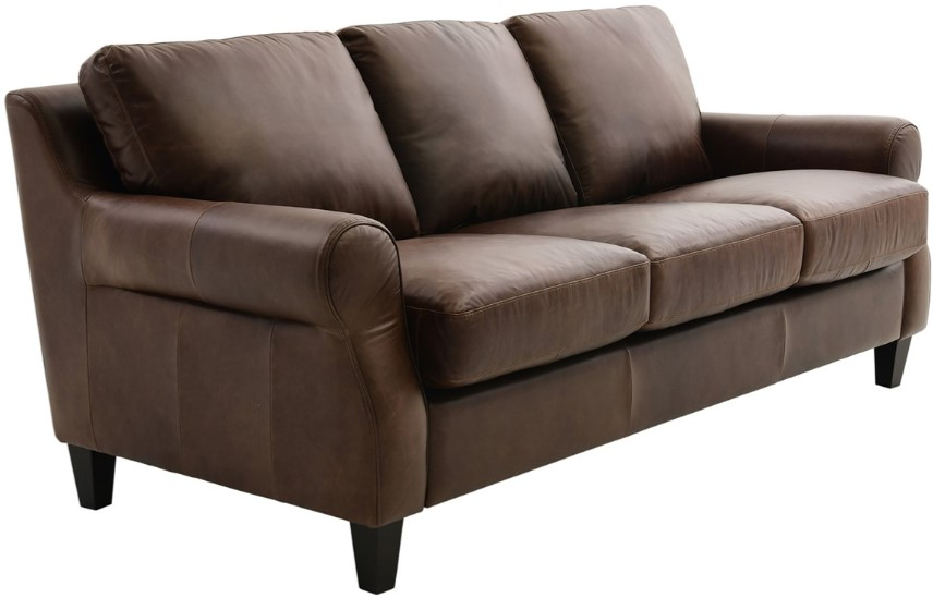 Upholstered in a chocolate brown top-grain Italian leather, this sofa features plump back cushions, plump feather-down seat cushions, padded rolled arms, stitched accents, tailored base, and dark brown tapered feet.Read More