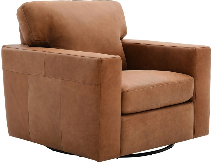 Upholstered in a soft caramel top-grain leather, this Oakland swivel chair features a plump back and seat cushion, padded track arms, stitched accents, tailored base, with a 360-degree swivel base.Read More