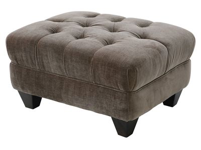 Upholstered in a mocha-colored velour fabric, this ottoman features a button-tufted plump cushion, tailored base, and tapered block feet in a dark driftwood finish.Read More