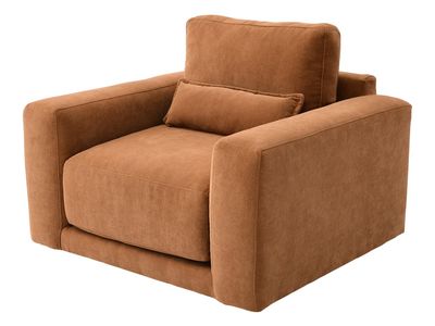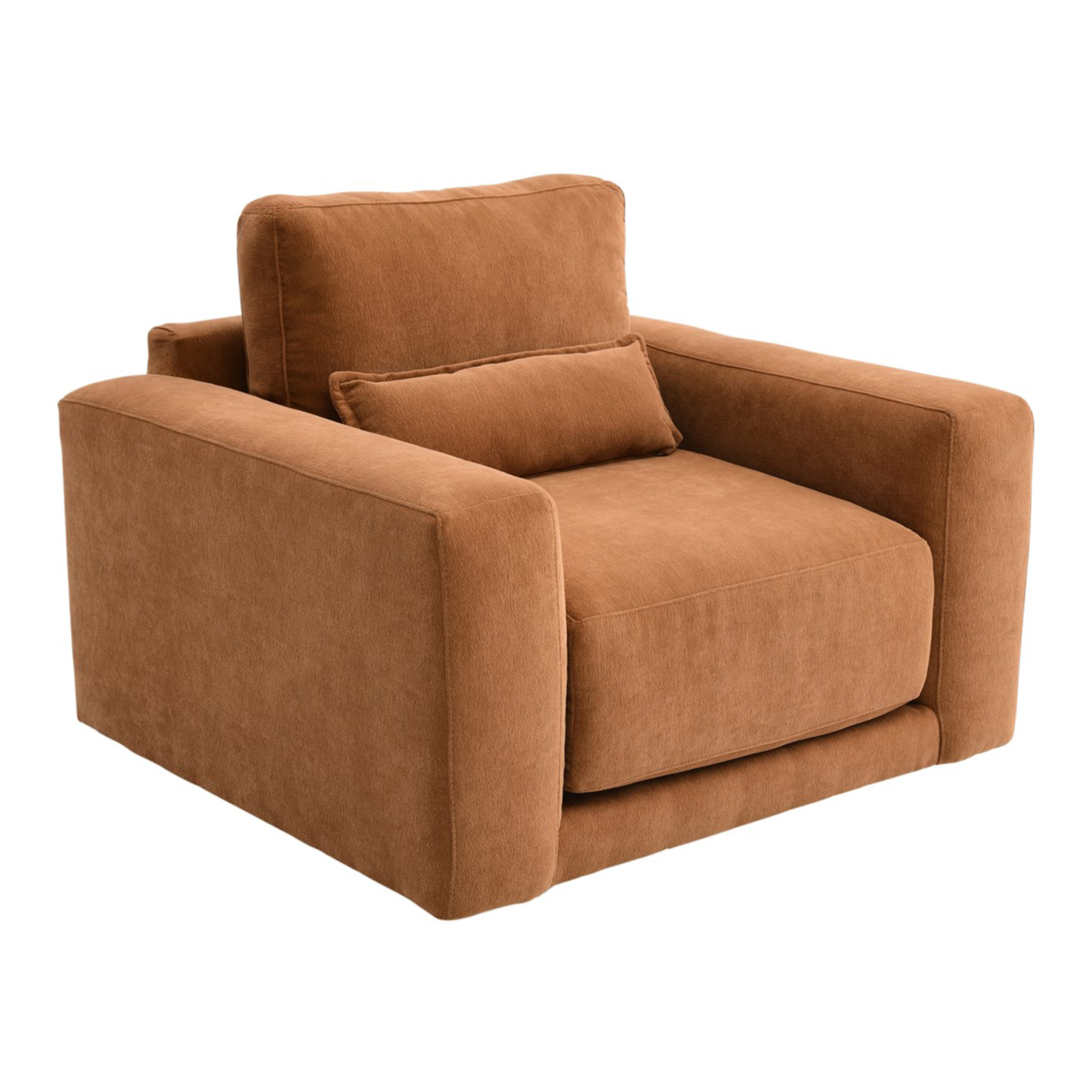 Upholstered in a cognac brown woven fabric, this swivel chair features a plump back and seat cushion, padded track arms, a matching kidney pillow, a low-profile tailored base, with a 360-degree swivel base.Read More