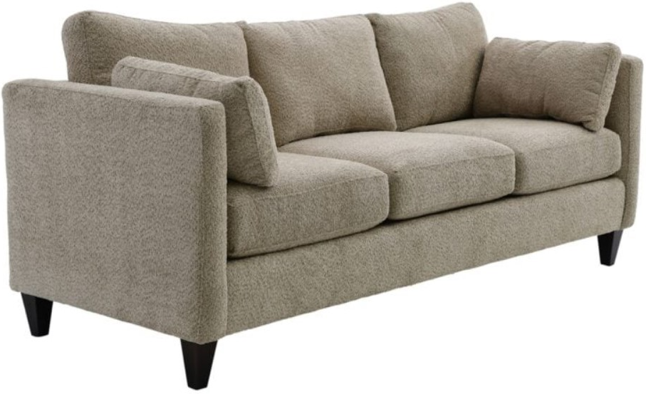 Upholstered in a latte tan woven fabric, this sofa features reversible back and seat cushions, padded track arms, two bolster pillows, tailored base, and tapered feet in a dark brown finish.Read More