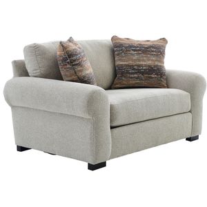 Upholstered in a tan woven fabric with light gray and cream undertones, this chair features a reversible back and seat cushion, padded rolled arms, two coordinating/contrasting toss pillows, tailored base, and block feet in an espresso finish.Read More