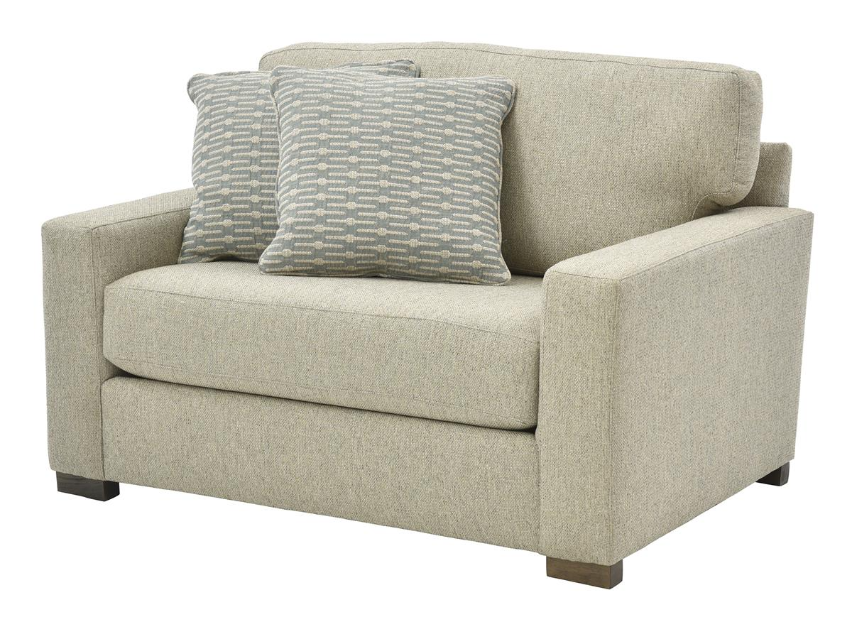 Covered in Malibu Quartz woven performance fabric, this chair features reversible back and seat cushions, padded track arms, two toss pillows and block feet in a driftwood finish.Read More