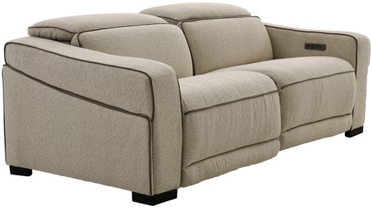 Upholstered in a light oat-colored woven fabric with tan and taupe undertones, this loveseat features power reclining headrests and chaise footrests, padded arms, mushroom-colored leather welt trim, plump seat cushions, two USB ports, two USB-C ports, and block feet in a black finish.Read More