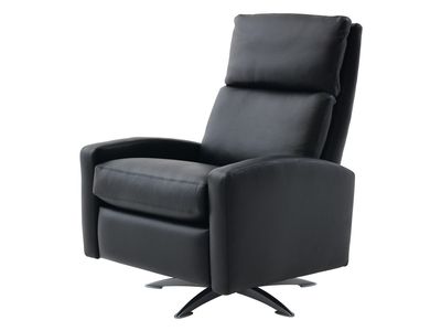 Upholstered in a black top-grain leather, this swivel recliner features a padded bustle back, a plump seat cushion, padded track arms, and a 360-degree swivel five-star metal base in a black finish.Read More
