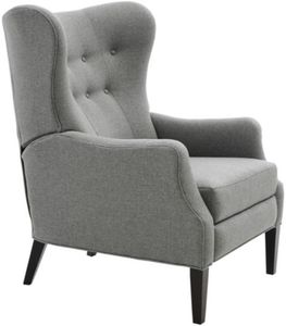 Upholstered in a graphite gray woven fabric with light gray, tan, and silver undertones, this recliner features a curved button-tufted padded back, a plump seat cushion, padded arms, and tapered feet in a dark brown finish.Read More