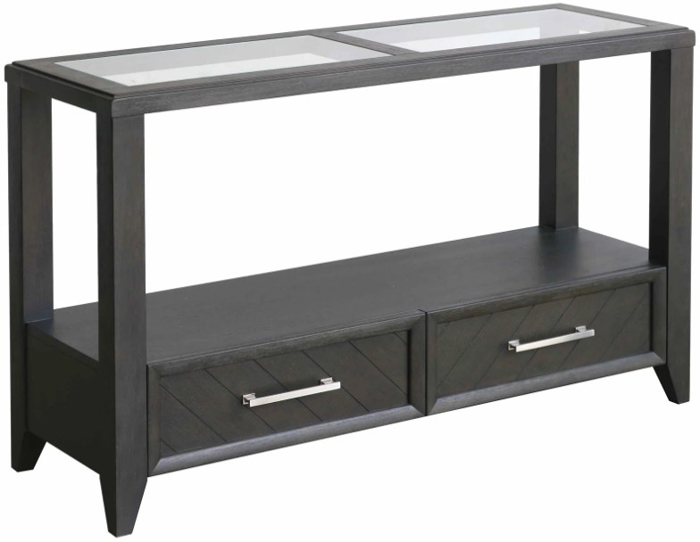 Crafted of poplar solids and red oak veneers in a shadow finish, this sofa table features two glass insets on the top, a lower shelf, two drawers with chevron detailed fronts, nickel finished drawer pulls, and tapered feet.Read More