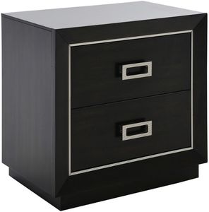 Crafted of rubberwood solids and birch veneers in a dark brown finish, this nightstand features a handsome top, silver-finished metal inlay and drawer pulls, two drawers, one USB port, one USB-C port, and a plinth base.Read More
