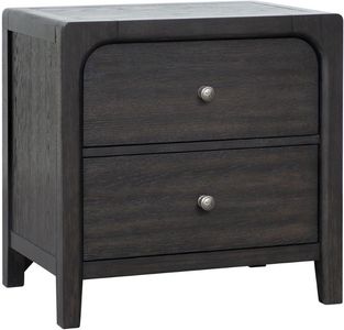 Crafted of rubberwood solids and white oak veneers in an espresso finish, this nightstand features two drawers, antique nickel finished metal drawer knobs, a USB port, a USB-C port, and tapered front feet.Read More