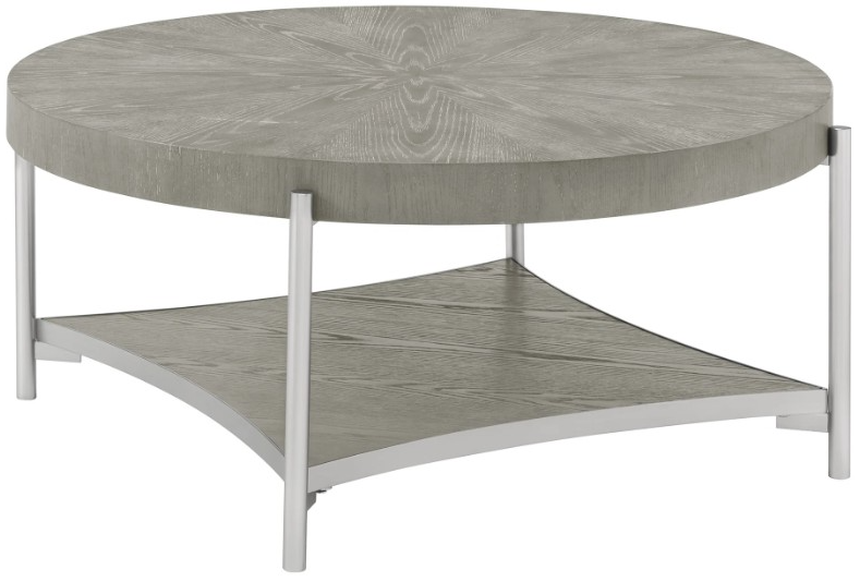 Crafted with select hardwood solids and veneers in a slate gray finish, this coffee table features a handsome top, a lower shelf, and a metal frame in a silver finish.Read More