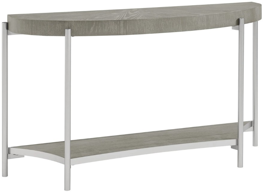 Crafted with select hardwood solids and veneers in a slate gray finish, this sofa table features a handsome top, a lower shelf, and a metal frame in a silver finish.Read More