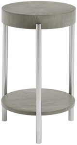 Crafted with select hardwood solids and veneers in a slate gray finish, this spot table features a handsome top, a lower shelf, and a metal frame in a silver finish.Read More