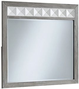 This beveled mirror has a frame crafted of pine solids and oak veneers in a gray finish and features a white finished geometric patterned inset. This piece will definitely add style in your room.Read More