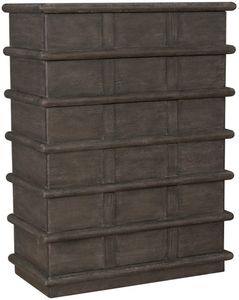 Crafted with select hardwood solids and veneers in a mocha finish, this chest features a handsome top, six drawers, a push to open mechanism for the drawers, grid panel design with horizontal molding accents, and a plinth base.Read More
