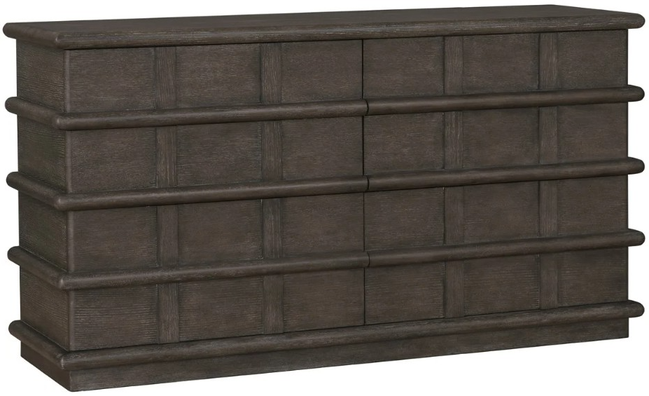 Crafted with select hardwood solids and veneers in a mocha finish, this dresser features a handsome top, eight drawers, a push to open mechanism for the drawers, grid panel design with horizontal molding accents, and a plinth base.Read More